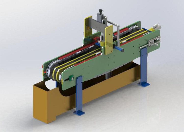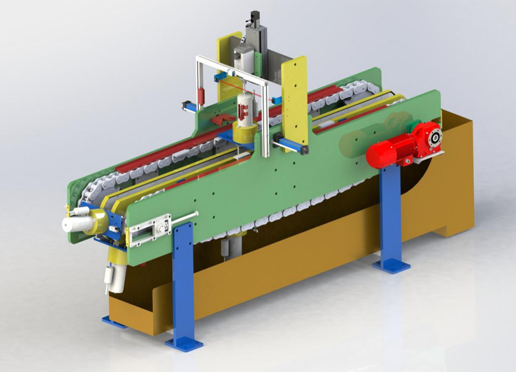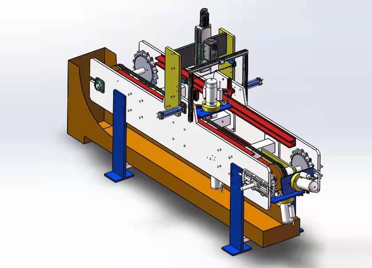 进料采用V型链板输送,压缩机不会在面板上滚动,保证了输送的稳定性,该输送装置实现了输送的自动化,提高了工作效率,是一种高效的输送装置。
