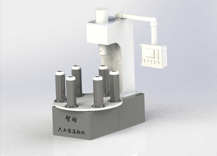 洗衣机滚筒压轴机机体由水平机架和竖直机架,竖直机架上设有平台,平台上设有与控制器连接的第一动力装置,第一动力装置的升降杆与压头连接,水平机架上设有主轴,主轴位于水平机架下方的一端,通过减速器与第二动力装置连接,主轴的另一端与转盘连接,转盘的上表面设有均匀分布的支筒,转盘的下表面设有与支筒交错设置的定位块,转盘的外沿上设有与定位块对应设置的卡槽,转盘靠近竖直机架的一端与支撑组件连接,转盘的一侧与定位组件连接。能够快速拆解洗衣机滚筒的塑料内筒和金属内筒轴,提高洗衣机滚筒的拆解效率,降低人工劳动强度。