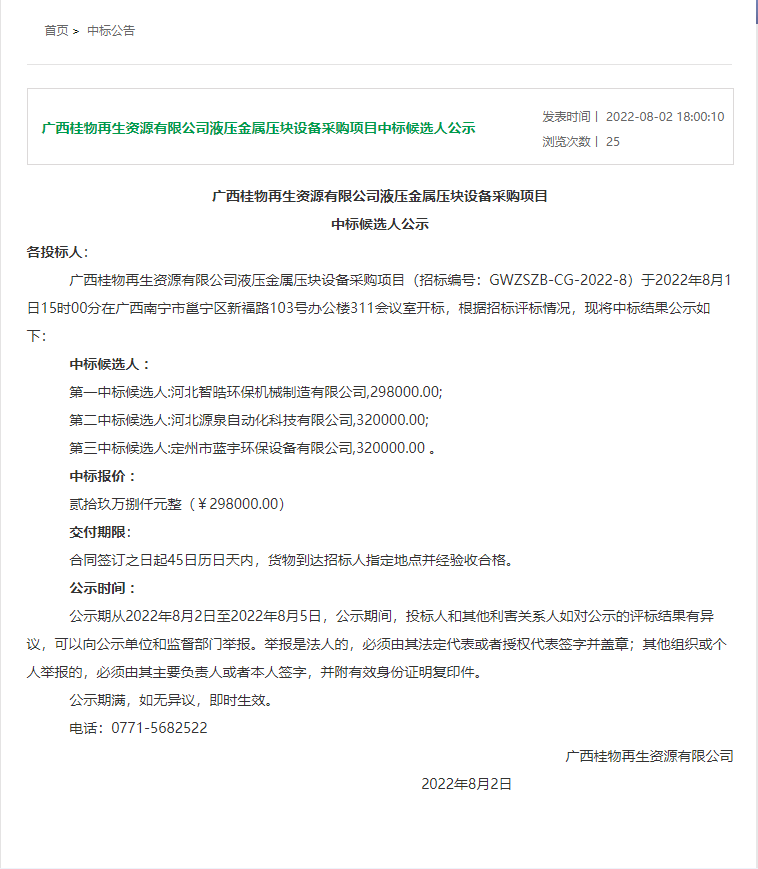 河北万忠环保技术服务有限公司液压金属打包机中标公示