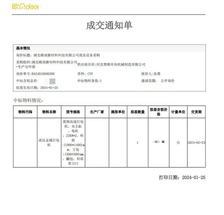 新年新气象,中标新篇章!在这个辞旧迎新的时刻,我们怀着激动的心情,向大家宣布,我们成功中标了湖北皓润新材料科技有限公司液压设备采购项目。这标志着我们在市场竞争中取得了新的突破,也为我们未来的发展奠定了坚实的基础。我们将以更加坚定的步伐,迈向更加辉煌的未来!